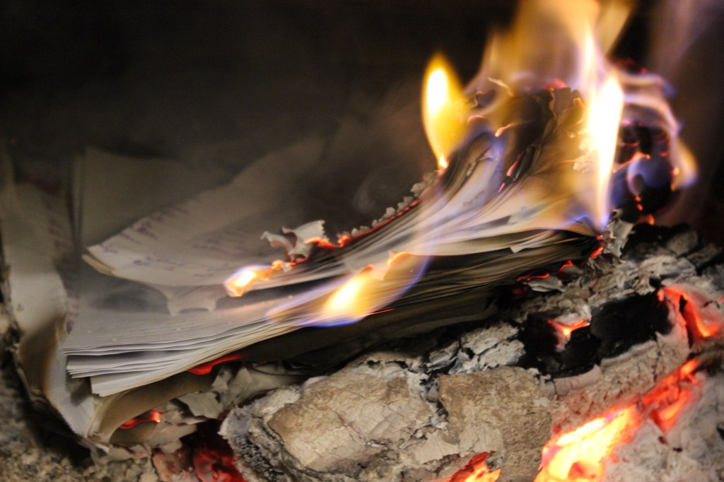 Intussen heb ik zo een tiental dagboeken geminimaliseerd. Het voelt telkens intens om een heel pak papier dat ik zelf heb volgeschreven te vernietigen. In de wintermaanden stopte ik ze in de kachel. Het had iets gepast dramatisch om de bladzijden te zien blakeren, omkrullen en dan plots oplaaien in de vlammen. Anders dan om ze nuchter tussen platgevouwen karton en oude kranten in de papierbak te stoppen.
