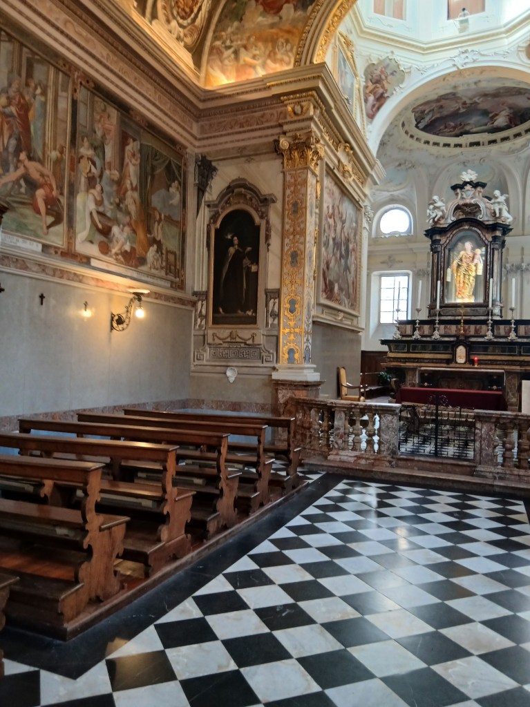 Aan de kassa van de stedelijke musea leg ik uit dat ik geen reservatie heb. Mi dispiace, Signora, we are sold out for today. Als troostprijs kan ik een combiticket kopen voor verschillende musea. Va bene, dat dan maar. Kan ik niet ergens via een tussendeur ontsnappen naar één van de groepjes op weg naar de begeerde kapel? Nee, ik ben veroordeeld tot kapotte vazen, sarcofagen en andere ouwe rommel. Er is ook schilderkunst en misschien ligt het aan mij, maar het ziet er vanmorgen allemaal wat somber uit. Terug in de centrale hal raap ik mijn moed en mijn beste Italiaans bijeen en spreek een suppoost aan. Gebeurt het niet af en toe dat mensen met een reservatie niet opdagen en er dus lege plekken in een time slot zijn? Jazeker, dat gebeurt, maar de plekken mogen niet doorverkocht worden aan wie toevallig langskomt. Ok, ik heb het geprobeerd, loslaten die fresco’s, ik doorblader de catalogus, maak van mijn hart een steen en ga weer de regen in. Goed dat die portieken er zijn.
