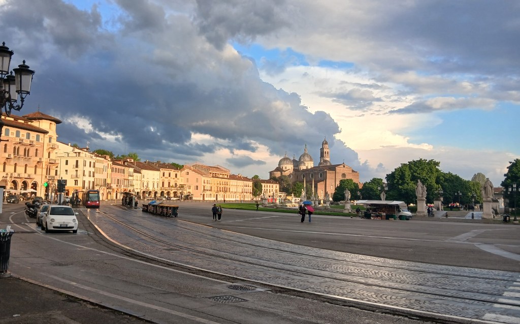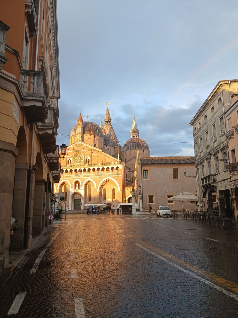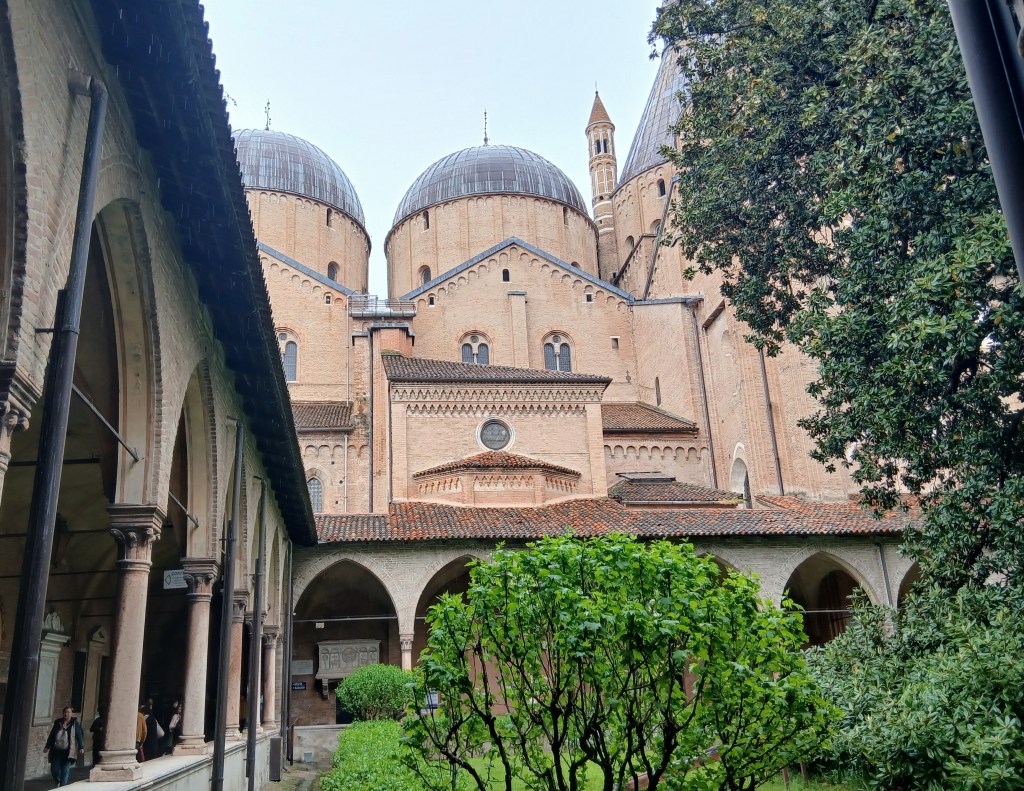 De basilica van de heilige Antonius en die van Santa Giustina op dat immense plein, de Prato della Valle. Eigenlijk een eiland van gras en een watergracht en brugjes en een heleboel standbeelden rondom. Misschien heeft de plek iets wanneer het zonnig is, maar nu is het er eerder zompig en ongezellig.