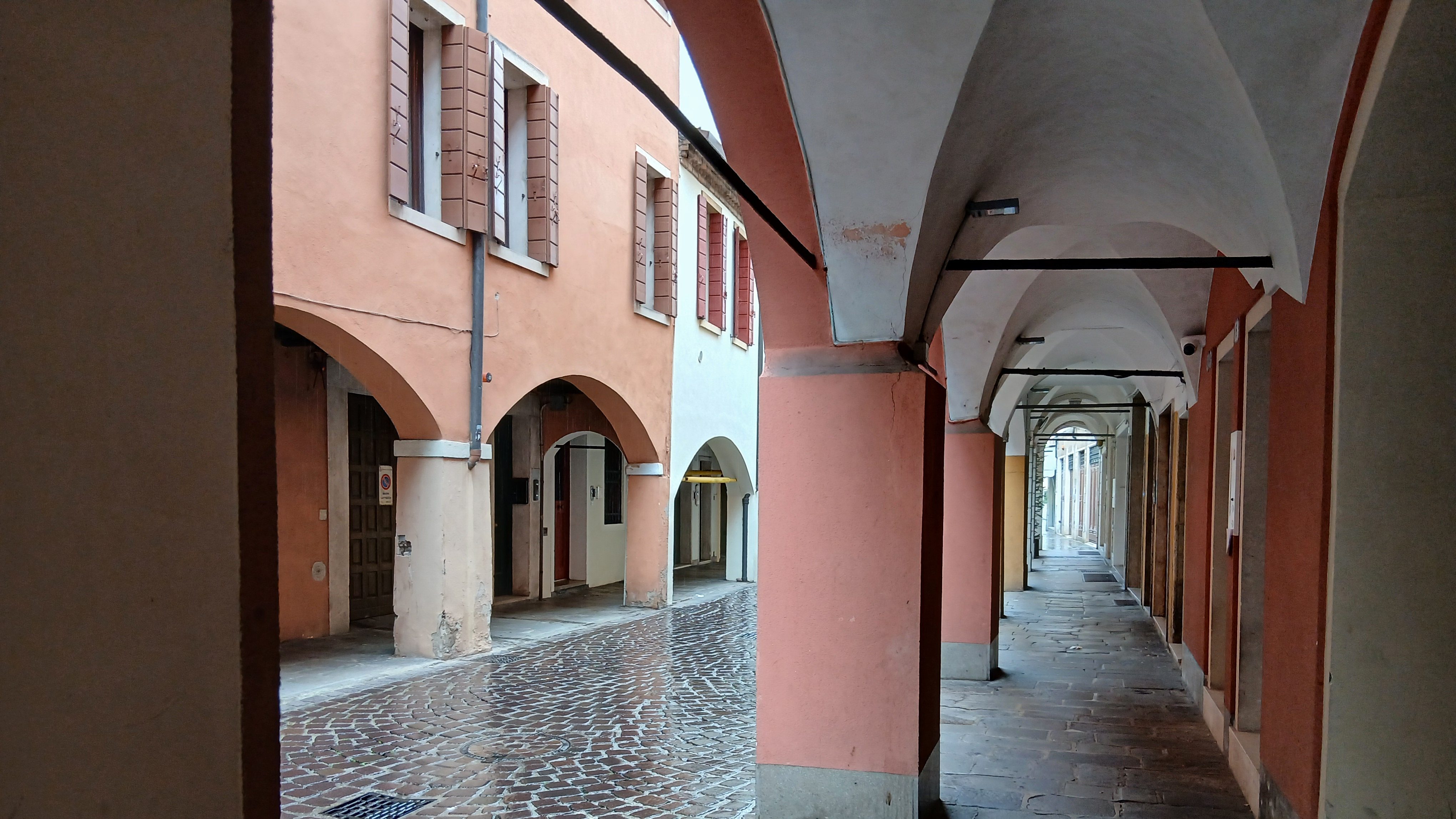 Na de kerken en het grasplein ben ik klaar om te ontsnappen naar een werelddeel waar de zon schijnt, of als dat niet mogelijk is, naar iets waar ik helemaal blij van word. Gisteren zag ik een affiche van een tentoonstelling over ‘schilders van de stilte’, met als uithangbord de Deen Hammershoi (denk er een streepje door de o bij). Alleen al van die affiche werd ik blij, maar die tentoonstelling loopt niet in Padua, wel in Rovigo, 40 km verderop. Is daar een station? Volgens de website van Trenitalia wel. Rijdt er uit Padua een trein heen? Ja, over zo’n 40 minuten en een enkeltje kost 5,75€. Kan ik zomaar Padua links laten liggen voor de rest van de dag en me op dit wispelturige pad begeven? Let’s do this. De realiteit is dat ik me aan de tegenovergestelde kant van het centrum bevind ten opzichte van het station. De pas erin. Ik kom door gezellige woonwijkjes langs de zogenaamde Riviera, de oevers van de Bacchiglione-rivier, maar opschieten doet het niet. In het station heb ik nog drie minuten om een ticket te kopen aan de automaten. Ongewoon voor ons Belgen: in Italië koop je een ticket voor een specifieke trein en enkele minuten voor het vertrek van de trein sluit de automaat de verkoop af. Basta, de trein van 15.09u naar Rovigo is geen optie meer.